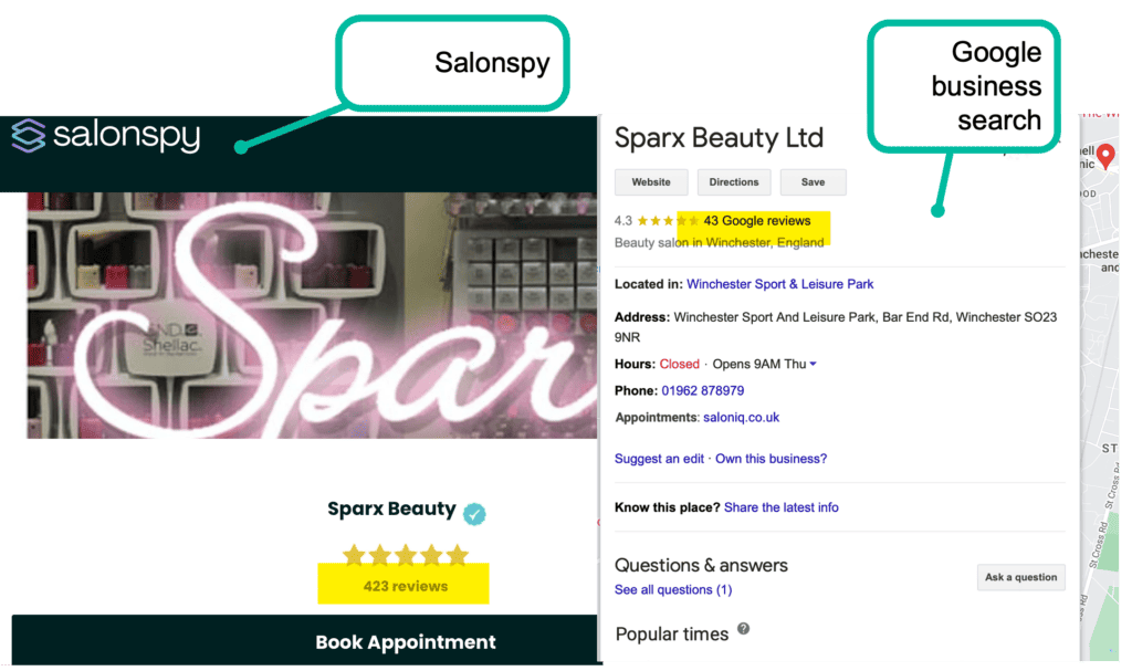 Here are some examples – our local beauty salon pushes it’s clients to review on salon spy, and as of 11th May 2022 has 423 reviews, but on Google Business, only 43. There reasoning is that people are more likely to find them via Salonspy rather than Google Maps.