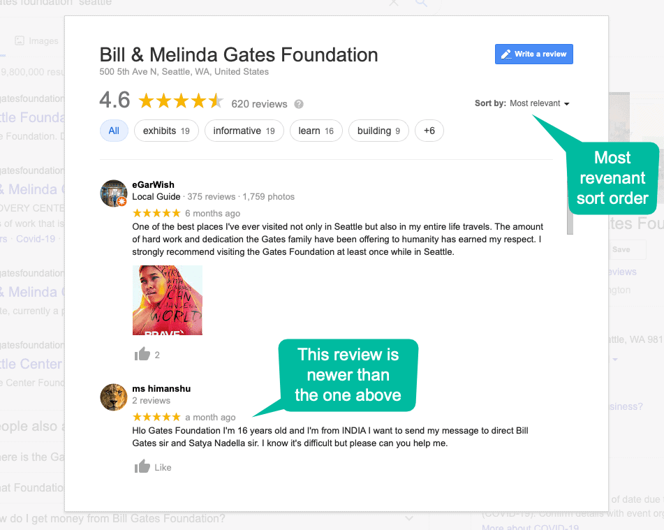 Looking at your Google My Business page – you may be surprised to see that your latest reviews are not a the top of the Google Review list. Check out the screenshot below from Bill and Melinda Gates Foundation’s review page on Google (which is well worth a visit by the way – the work is life-saving and innovative).